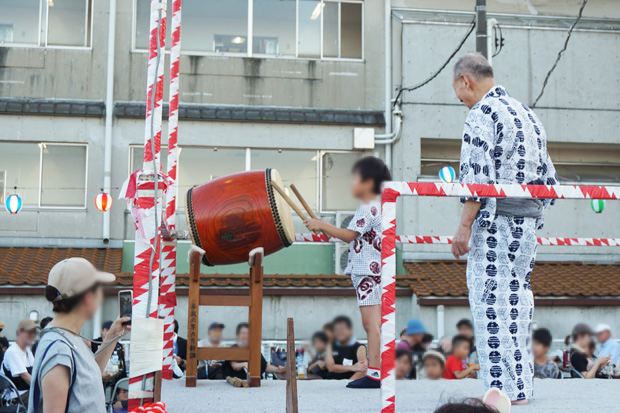 ▲小さなお子さんが登壇。太鼓を教える長寿会の方が優しく周囲の方が皆、笑顔で見守ってました。