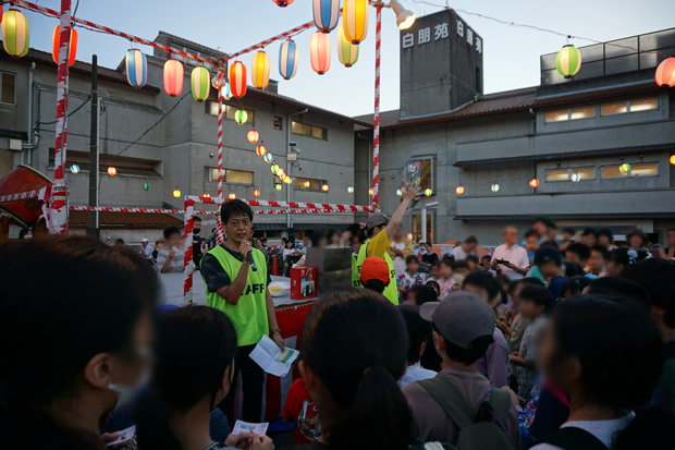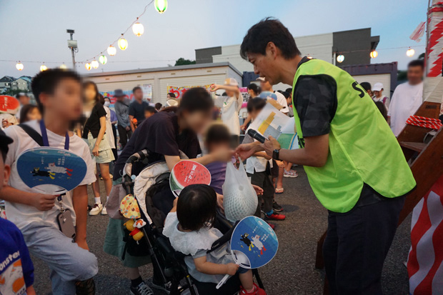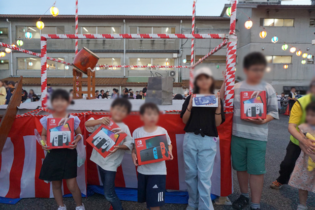 盆踊りが一息ついたところで、参加された皆さんお待ちかねの抽選会が始まります。まずは子ども抽選会からスタート。景品は各種おもちゃに加え豪華なゲーム機(計5台)を用意しました。