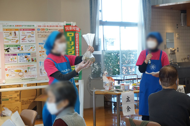 南区食生活等改善推進委員会(愛称:ヘルスメイト)の皆さんが備蓄食品の準備をしてくださいました。千保町内会副会長の鈴木さん、民生委員の大谷さん、別所地域ケアプラザも運営に携わっています。
